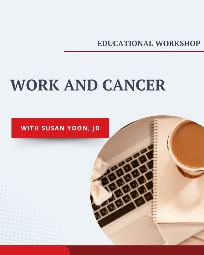 Join us for Work & Cancer, an informative educational workshop designed to help individuals navigate employment during and after a cancer diagnosis. This session will be led by **Susan Yoon, Staff Attorney at Triage Cancer**, who will provide expert guidance on workplace rights, legal protections, and practical considerations for managing work while undergoing treatment or transitioning back to employment. Topics may include reasonable accommodations, medical leave options, disability benefits, health insurance considerations, and how to communicate effectively with employers. This workshop is ideal for patients, survivors, and caregivers seeking clear, reliable information to make informed decisions about work and cancer.