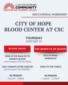 Sign up for a donation time slot: cancersupport.link/blooddrive Walk-ins welcome too. Open to the public