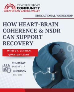 Discover how tuning into your body’s natural rhythms can promote deep healing and resilience. In this fascinating workshop, Katelyn Lehman, PhD of Quantum Clinic will explore the science and practice of Heart-Brain Coherence and Non-Sleep Deep Rest (NSDR)—powerful tools for reducing stress, supporting emotional balance, and enhancing overall well-being. Participants will learn simple, restorative techniques that can be integrated into daily life to help regulate the nervous system, improve sleep, and cultivate a greater sense of calm and connection. This workshop is ideal for anyone navigating cancer—patients, survivors, and caregivers alike—seeking holistic ways to support the body and mind throughout the healing journey.