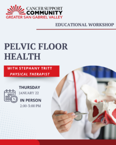 Join Stephany Tritt, PT, a specialized Pelvic Floor Physical Therapist, for an informative and empowering session on how cancer treatments can affect pelvic floor health—and what you can do to restore strength, comfort, and confidence. In this workshop, participants will learn: How cancer treatments and surgeries can impact pelvic floor function Simple strategies and lifestyle adjustments to support pelvic health Foundational pelvic floor exercises to promote healing and strength This class is open to all individuals affected by cancer, including survivors and those currently in treatment. No prior experience is needed—just wear comfortable clothing and come ready to learn practical tools for a healthier, stronger pelvic floor.