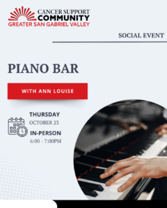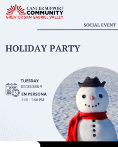 Join Cancer Support Community for a holiday potluck with live holiday music performances and gift raffle. Bring a main dish or side dish to share! We will provide dessert. Please register so we know how many people to expect. This is an in person, family-friendly event.