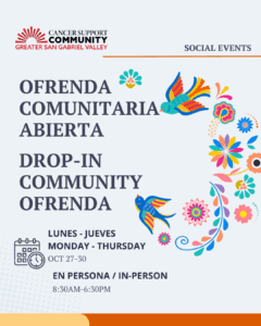 Le invitamos a traer fotos de sus seres queridos que han fallecido (contamos con marcos de 4×6, o puede traer el suyo). / Bring photos of loved ones who have passed (we have 4×6 frames, or bring your own). Escriba una carta para alguien a quien extrañe. / Write a letter to someone to you miss.Traiga su bocadillo no perecedero favorito para el altar./ Bring their favorite non-perishable snack for the alter.