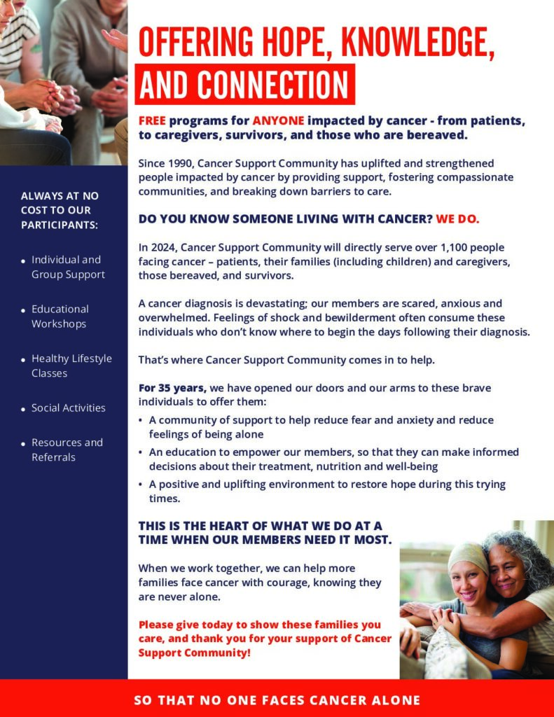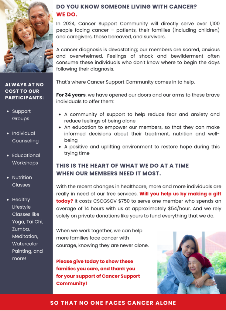 Cancer Support Community relies solely on private donations to support our work. Learn about ways to support us through fundraising efforts, donations, or volunteer opportunities. Learn more.